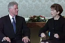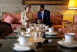 McAleese used her time in office to address issues concerning justice, social equality, social inclusion, anti-sectarianism and reconciliation. She described her presidency's theme as "Building Bridges".[9] This bridge-building materialised in her attempts to reach out to the unionist community in Northern Ireland. These steps included celebrating the Twelfth of July at Áras an Uachtaráin and taking Communion in a Church of Ireland cathedral in Dublin, for which she incurred some criticism from some of the Irish Catholic hierarchy.[10] Though a Catholic, McAleese holds liberal views on homosexuality and women priests.[11] She is a member of the Council of Women World Leaders and was ranked the 64th most powerful woman in the world by Forbes.[12] In spite of some minor controversies,[13] McAleese remained popular, and her presidency is regarded as successful.[14][15][16]