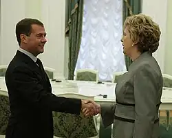She made an official visit to Russia, with Minister of State, Billy Kelleher, for four days in September 2010, and met with President of Russia Dmitry Medvedev.[64][65] She spoke kindly of Mikhail Gorbachev, officially invited Medvedev to Ireland, and addressed students at a university in Saint Petersburg. She called for warmer relations between the European Union and Russia.[66][67][68] On her state tour to Russia, highlighting the importance of competence, she launched an unprecedented attack on the Central Bank of Ireland, for their role in the financial crisis which resulted in tens of thousands of people in mortgage arrears.[69][70]