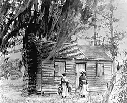 Mary Jane McLeod was born on July 10, 1875, in a small log cabin near Mayesville, South Carolina, on a rice and cotton farm in Sumter County.[5] She was the fifteenth of seventeen children born to Sam and Patsy (née McIntosh) McLeod, both former slaves.[6][7][8] Patsy McLeod worked after emancipation for her former owner, earning enough to buy five acres from him.[a] There, Sam and their sons built the log cabin in which McLeod was born.[10] McLeod grew up hearing stories from her maternal grandmother, Sophie, about resistance to slavery, and both Sophie and Patsy told McLeod that she was special. McLeod credited them both with inspiring her work toward equality.[11]