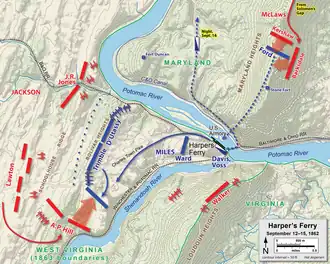 As Jackson's three columns approached Harpers Ferry, Col. Dixon S. Miles, Union commander of the garrison, insisted on keeping most of the troops near the town instead of taking up commanding positions on the surrounding heights. The South Carolinians under Brig. Gen. Joseph B. Kershaw encountered the slim defenses of the most important position, Maryland Heights, but only brief skirmishing ensued. Strong attacks by the brigades of Kershaw and William Barksdale on September 13 drove the mostly inexperienced Union troops from the heights.[39]