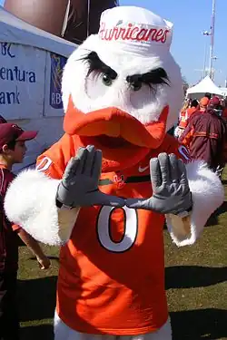 University of Miami mascot Sebastian the Ibis makes the University of Miami's signature "The U" hand gesture, December 2007.