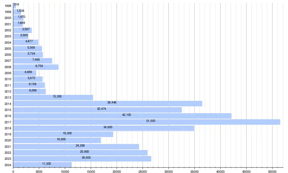 Maserati sales in 2013 was 15,400 units, which is up from just over 6,000 units worldwide in 2012 (2013 included the release of the new Quattroporte and Ghibli towards the end of the year, and thus the first year to fully represent the sales inclusive of these models is 2014).[44] In May, 2014, Maserati sold a company record of over 3,000 cars worldwide, causing them to increase production of the Ghibli and Quattroporte.[45] For that same month in the United States, Maserati sold 1,114 vehicles, which is up 406.19% over the same month in the previous year in the United States.[46] Maserati's best month of sales in the United States was September 2014, with 1,318 units sold.[47] The month in 2014 where the increase on sales for the same month of the previous year was the highest was May, with a volume increase of 406.19%.[47] The sales target for 2018 was 75,000 units worldwide.[44]