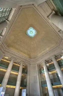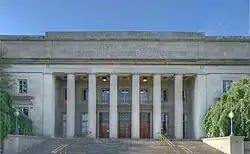 MIT's School of Architecture, founded in 1865[132] and now called the School of Architecture and Planning, was the first formal architecture program in the United States,[133] and it has a history of commissioning progressive buildings.[134][135] The first buildings constructed on the Cambridge campus, completed in 1916, are sometimes called the "Maclaurin buildings" after Institute president Richard Maclaurin who oversaw their construction. Designed by William Welles Bosworth, these imposing buildings were built of reinforced concrete, a first for a non-industrial – much less university – building in the US.[136] Bosworth's design was influenced by the City Beautiful Movement of the early 1900s[136] and features the Pantheon-esque Great Dome housing the Barker Engineering Library. The Great Dome overlooks Killian Court, where graduation ceremonies are held each year. The friezes of the limestone-clad buildings around Killian Court are engraved with the names of important scientists and philosophers.[a] The spacious Building 7 atrium at 77 Massachusetts Avenue is regarded as the entrance to the Infinite Corridor and the rest of the campus.[117]