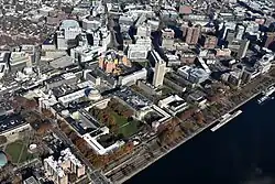 The curriculum drifted to a vocational emphasis, with less focus on theoretical science.[35] The fledgling school still suffered from chronic financial shortages which diverted the attention of the MIT leadership. During these "Boston Tech" years, MIT faculty and alumni rebuffed Harvard University president (and former MIT faculty) Charles W. Eliot's repeated attempts to merge MIT with Harvard College's Lawrence Scientific School.[36] There would be at least six attempts to absorb MIT into Harvard.[37] In its cramped Back Bay location, MIT could not afford to expand its overcrowded facilities, driving a desperate search for a new campus and funding. Eventually, the MIT Corporation approved a formal agreement to merge with Harvard and move to Allston, over the vehement objections of MIT faculty, students, and alumni.[37] The merger plan collapsed in 1905 when the Massachusetts Supreme Judicial Court ruled that MIT could not sell its Back Bay land.[38]