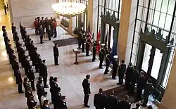 MIT has its own police force. Three days after the Boston Marathon bombing of April 2013, MIT Police patrol officer Sean Collier was fatally shot by the suspects Dzhokhar and Tamerlan Tsarnaev, setting off a violent manhunt that shut down the campus and much of the Boston metropolitan area for a day.[97] One week later, Collier's memorial service was attended by more than 10,000 people, in a ceremony hosted by the MIT community with thousands of police officers from the New England region and Canada.[98][99][100] On November 25, 2013, MIT announced the creation of the Collier Medal, to be awarded annually to "an individual or group that embodies the character and qualities that Officer Collier exhibited as a member of the MIT community and in all aspects of his life". The announcement further stated that "Future recipients of the award will include those whose contributions exceed the boundaries of their profession, those who have contributed to building bridges across the community, and those who consistently and selflessly perform acts of kindness".[101][102][103]