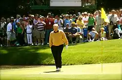 Player became the first non-American to win the Masters in 1961, beating Palmer, the defending champion, by one stroke when Palmer double-bogeyed the final hole.[15] In 1974, he won again by two strokes.[15] After not winning a tournament on the U.S. PGA tour for nearly four years, and at the age of 42, Player won his third and final Masters in 1978 by one stroke over three players.[15] Player is second in consecutive cuts made with 23 straight (tied with Fred Couples), and has played in a record 52 Masters.[21][22]