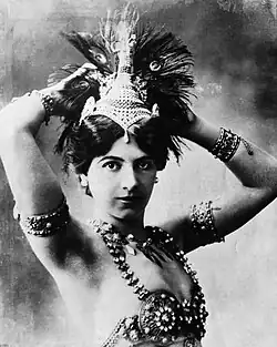 Margaretha Geertruida MacLeod (née Zelle, Dutch: [mɑrɣaːˈreːtaː ɣeːrˈtrœydaː ˈzɛlə]; 7 August 1876 – 15 October 1917), better known by the stage name Mata Hari (/ˈmɑːtə ˈhɑːri/ MAH-tə HAR-ee, Dutch: [ˈmaːtaː ˈɦaːri]; Indonesian for 'sun', lit. 'eye of the day'), was a Dutch exotic dancer and courtesan who was convicted of being a spy for Germany during World War I. She was executed by firing squad in France.[1]