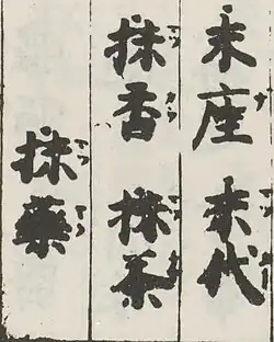 The characters for matcha (抹茶) also appear in the Japanese dictionary Unpo Iroha Shū (1548), compiled during the Muromachi period.[49] The Book of Agriculture (1313) by Wang Zhen (fl. 1290–1333) of the Yuan dynasty includes the terms mòchá (末茶) and mòzichá (末子茶). One theory suggests that these words were adopted and transformed into the term "matcha" in Japan.[43] However, as this book was published about a century after Eisai, no documentary evidence confirms whether these terms were introduced to Japan or evolved into "matcha" by the 16th century.