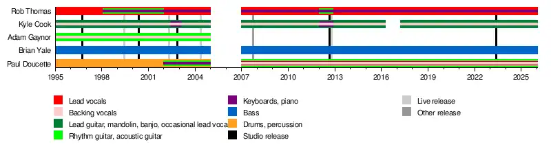 On April 9, 2016, Kyle Cook left the band citing a communication breakdown between the members, but returned in 2017.[10] In 2017 the band toured with the A Brief History of Everything Tour with Counting Crows.[11] Duo Rivers and Rust joined them as an opening act.[12] Doucette described the tour as a celebration of the band's history – stating it "was always going to happen. It just took a bit for everyone to realize that."[13][14] He said that the band had no plans to release new albums soon at that time and were focused on touring.[15] The band was set to undertake a North American summer tour in 2020 alongside The Wallflowers.[16] Due to the COVID-19 pandemic in the United States, the tour was rescheduled three times, first to 2021, then to 2022, and then to 2023. The band played a one-off performance headlining in St. John’s, Newfoundland, Canada for the Churchill Park Music Festival in July 2022.[17][18][19][20]