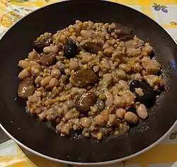 • Crapiata, a peasant soup with chickpeas, beans, broad beans, wheat, lentils, cicerchie. An old recipe dating to the Roman period, later enriched with other ingredients such as potatoes, it is a common ritual grown into "Sassi di Matera" and celebrated on 1 August[76]