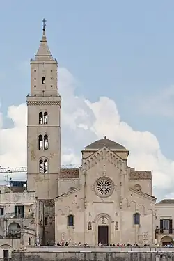 After his departure Matera elected William Iron Arm as its count (1042),[47][50] but like other towns it remained in Byzantine hands despite the Norman advances[51] – in 1054 died Sico, the protospatharios of Matera.[52] The city was seized in April 1064 as an independent acquisition by Robert, Count of Montescaglioso, a seditious nephew of Robert Guiscard, who profited from the involvement of his uncle further south.[53][54][55] After count Robert died in July 1080, Matera accepted the rule of his brother Geoffrey of Conversano.[56][57] Geoffrey's son Alexander joined a revolt against Roger II in 1132, but he fled before the advance of the king to Byzantium and left his son Geoffrey in Matera, whose inhabitants gave the city away to avoid being massacred by the royal troops.[58] Alexander later took part in the Byzantine invasion of Italy in 1156.[59] Lombard aristocrats survived with a reduced status: around 1150, Guaimar (III) of Capaccio, a descendant of Lombard princes, held a sub-fief near Matera from the count of Montescaglioso.[60] Meanwhile, after a period of association with the Byzantine metropolis of Otranto from 968,[61] the episcopal see of Matera was reclaimed by the archbishopric of Acerenza.[62] A new cathedral church of St Eustace was consecrated in May 1082.[63]