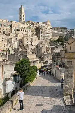 Yet it was only at the turn of the twentieth century that the Sassi were declared unfit for modern habitation,[11] and the government relocation of all their inhabitants to new housing in the Piano followed between 1952 and the 1970s.[12] A new law in 1986 opened the path to restoration and reoccupation of the Sassi, this time – as noted by the architectural historian Anne Toxey – for the benefit of the wealthy middle class. The recognition of the Sassi, labelled la città sotterranea ("the underground city"), together with the rupestrian churches across the Gravina as a UNESCO World Heritage Site in December 1993 has assisted in attracting tourism and accelerated the reclaiming of the site.[13] In 2019, Matera was declared a European Capital of Culture.[14]