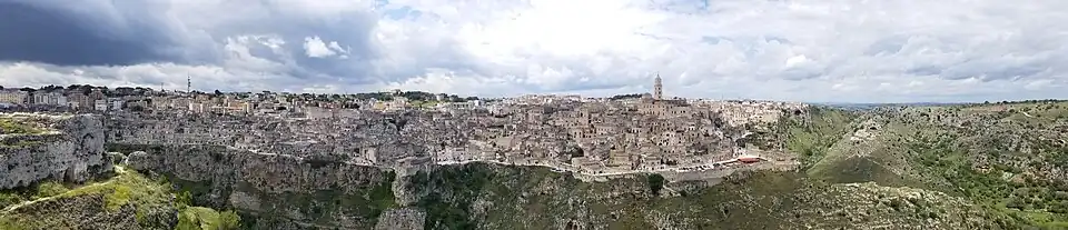 Matera lies on the right bank of the Gravina river, whose canyon forms a geological boundary between the hill country of Basilicata (historic Lucania) to the southwest and the Murgia plateau of Apulia to the northeast.[3] The city began as a complex of cave habitations excavated in the softer limestone on the gorge's western, Lucanian face.[4] It took advantage of two streams that flow into the ravine from a spot near the Castello Tramontano, reducing the cliff's angle of drop and leaving a defensible narrow promontory between the streams. The central high ground, or acropolis, supporting the city's cathedral and administrative buildings, came to be known as Civita, and the settlement districts scaling down and burrowing into the sheer rock faces as the Sassi. Of the two streambeds, called the grabiglioni, the northern hosts Sasso Barisano (facing Bari) and the southern Sasso Caveoso (facing Montescaglioso).[5]