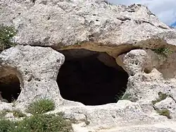 The Murgia National Park (Parco della Murgia Materana), a regional park established in 1990, includes the territory of the Gravina di Matera and about 150 rock churches scattered along the slopes of the ravines and the plateau of the Murgia. This area, inhabited since prehistoric times, still preserves stationing dating back to the Paleolithic, such as the Grotta dei pipistrelli (cave of the bats), and to the Neolithic.[71][72] The symbol of the park is the lesser kestrel.