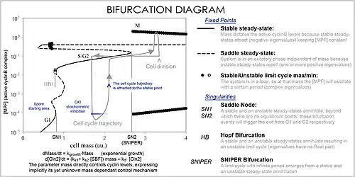A better representation, which handles the large number of variables and parameters, is a bifurcation diagram using bifurcation theory. The presence of these special steady-state points at certain values of a parameter (e.g. mass) is represented by a point and once the parameter passes a certain value, a qualitative change occurs, called a bifurcation, in which the nature of the space changes, with profound consequences for the protein concentrations: the cell cycle has phases (partially corresponding to G1 and G2) in which mass, via a stable point, controls cyclin levels, and phases (S and M phases) in which the concentrations change independently, but once the phase has changed at a bifurcation event (Cell cycle checkpoint), the system cannot go back to the previous levels since at the current mass the vector field is profoundly different and the mass cannot be reversed back through the bifurcation event, making a checkpoint irreversible. In particular the S and M checkpoints are regulated by means of special bifurcations called a Hopf bifurcation and an infinite period bifurcation.