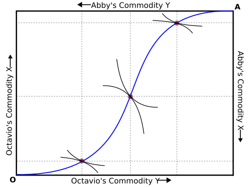 Given two individuals, the set of solutions where both individuals can maximize utility is described by the contract curve on what is now known as an Edgeworth Box. Technically, the construction of the two-person solution to Edgeworth's problem was not developed graphically until 1924 by Arthur Lyon Bowley.[34] The contract curve of the Edgeworth box (or more generally on any set of solutions to Edgeworth's problem for more actors) is referred to as the core of an economy.[35]