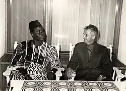 Kérékou was born in 1933 in Kouarfa village,[1] in north-west French Dahomey. After having studied at military schools in modern-day Mali and Senegal,[1] Kérékou served in the military by joining the French Army in 1960.[2] Following independence, from 1961 to 1963 he was an aide-de-camp to Dahomeyan President Hubert Maga.[3] Following Maurice Kouandété's coup d'état in December 1967, Kérékou, who was his cousin,[3][4] was made chairman of the Military Revolutionary Council.[3] After Kérékou attended French military schools from 1968 to 1970,[3] Maga made him a major, deputy chief of staff, and commander of the Ouidah paratroop unit.[3][4]
