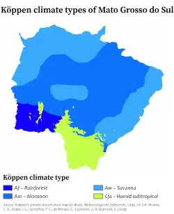 The state has the 4th largest cattle herd in Brazil, with a total of 21.4 million head of cattle.[17] The state is a major exporter of beef, but also poultry and pork. In poultry farming, the state had, in 2017, a flock of 22 million birds.[18] In pork, in 2019, Mato Grosso do Sul slaughtered more than 2 million animals. The state occupies the 7th Brazilian position in pig farming, moving towards becoming the 4th largest Brazilian producer in the coming years.[19]