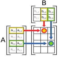 The figure to the right illustrates diagrammatically the product of two matrices A and B, showing how each intersection in the product matrix corresponds to a row of A and a column of B.
