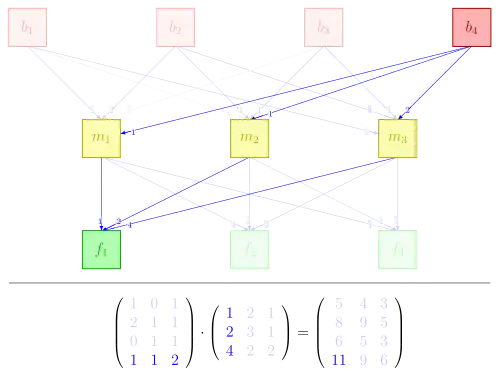 this matrix directly provides the amounts of basic commodities needed for given amounts of final goods. For example, the bottom left entry of is computed as , reflecting that units of are needed to produce one unit of . Indeed, one unit is needed for , one for each of two , and for each of the four units that go into the unit, see picture.