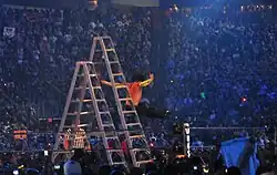 At the Royal Rumble pay-per-view on January 25, after losing an ECW Championship rematch to Swagger, Hardy turned on his brother when he hit Jeff with a steel chair, allowing Edge to win the WWE Championship, turning heel.[119] On the January 27 episode of ECW, it was announced by General Manager Theodore Long that Hardy had requested, and been granted, his release from ECW and had re-signed with the SmackDown brand.[120] As part of the buildup to this feud, Matt strongly implied that he was responsible for all of Jeff's accidents leading back to November, including an assault in a hotel stairwell that prevented Jeff from appearing at Survivor Series, an automobile accident where Jeff's car was run off the road, and a pyrotechnics malfunction where part of the pyro from Jeff's entrance was fired directly at Jeff, in an attempt to stop Jeff holding the WWE Championship. Despite Hardy's attempts to goad Jeff into fighting him, Jeff refused to fight his brother, but, on the March 6 episode of SmackDown, Jeff attacked him during a promo where Matt implied that he was also responsible for the fire that burned down Jeff's house, going so far as to reveal that he had in his possession a dog collar that supposedly belonged to Jeff's dog, Jack (who died in the fire), that he claimed to have salvaged from the wreckage of the house. At WrestleMania 25 on April 5, Matt defeated Jeff in an Extreme Rules match, and in a stretcher match on the following episode of SmackDown.[121][122][123]