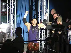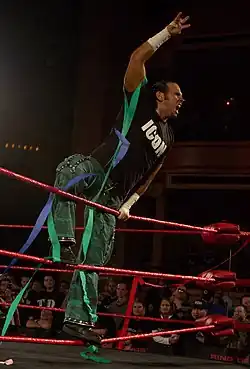 Hardy appeared at a scheduled Ring of Honor (ROH) event on July 16, 2005, in Woodbridge, Connecticut, where he defeated Christopher Daniels via submission.[62] Hardy also cut a brief worked shoot promo where he criticized WWE and John Laurinaitis. Following his official return to WWE, Hardy was met with backlash following a match with Homicide from the fans at a subsequent ROH event, which Hardy won.[63] The next day at his final ROH appearance, he lost to Roderick Strong.[64]