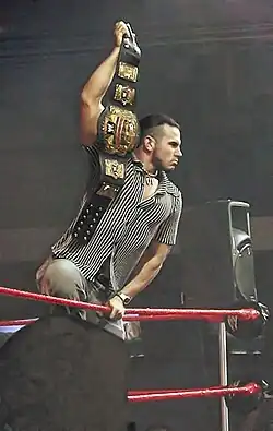 On the July 22 episode of ECW, Hardy became the number one contender to Mark Henry's ECW Championship after defeating John Morrison, The Miz and Finlay in a fatal four-way match.[114] He won the title match at SummerSlam on August 17 by disqualification due to interference from Henry's manager, Tony Atlas, thus he failed to win the title.[115] Due to the ending of the SummerSlam match, Hardy received a rematch for the title on the next episode of ECW, but again failed to win the title when Henry pinned him after a distraction by Atlas.[116] At Unforgiven on September 7, Hardy won the ECW Championship during the Championship scramble match, defeating then-champion Henry, The Miz, Finlay and Chavo Guerrero Jr. by pinning the Miz with three minutes left, marking his first world heavyweight championship win.[117] He continued to feud with Henry until No Mercy on October 5, where Hardy retained the title. Hardy lost the title to Jack Swagger on the January 13, 2009, episode of ECW, which was taped on January 12.[118]