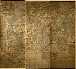 In 1583, Ricci and Ruggieri settled in Zhaoqing, at the invitation of the governor of Zhaoqing, Wang Pan, who had heard of Ricci's skill as a mathematician and cartographer. Ricci stayed in Zhaoqing from 1583 to 1589, when he was expelled by a new viceroy. It was in Zhaoqing, in 1584, that Ricci composed the first European-style world map in Chinese, called "Da Ying Quan Tu" (Chinese: 大瀛全圖; lit. 'Complete Map of the Great World').[5] No prints of the 1584 map are known to exist, but, of the much improved and expanded Kunyu Wanguo Quantu of 1602,[6] six recopied, rice-paper versions survive.[7]