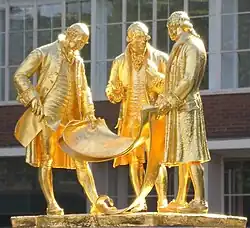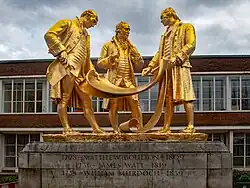 Boulton is recognised by several memorials and other commemorations in and around Birmingham. Soho House, his home from 1766 until his death, is now a museum,[120] as is his first workshop, Sarehole Mill.[121] Matthew Boulton's family papers, along with the records of James Watt and family and the firm of Boulton and Watt collectively form the Archives of Soho and are held at Birmingham Archives and Collections,[43] at the Library of Birmingham. He is recognised by blue plaques at his Steelhouse Lane birthplace and at Soho House.[122] A gilded bronze statue of Boulton, Watt and Murdoch (1956) by William Bloye stands opposite Centenary Square in central Birmingham.[123] Matthew Boulton College was named in his honour in 1957.[124] The two-hundredth anniversary of his death, in 2009, resulted in a number of tributes. Birmingham City Council promoted "a year-long festival celebrating the life, work and legacy of Matthew Boulton".[125]