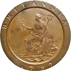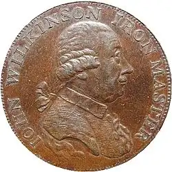 The national financial crisis reached its nadir in February 1797, when the Bank of England stopped redeeming its bills for gold. In an effort to get more money into circulation, the Government adopted a plan to issue large quantities of copper coins, and Lord Hawkesbury summoned Boulton to London on 3 March 1797, informing him of the Government's plan. Four days later, Boulton attended a meeting of the Privy Council, and was awarded a contract at the end of the month.[80] According to a proclamation dated 26 July 1797, King George III was "graciously pleased to give directions that measures might be taken for an immediate supply of such copper coinage as might be best adapted to the payment of the laborious poor in the present exigency ... which should go and pass for one penny and two pennies".[81] The proclamation required that the coins weigh one and two ounces respectively, bringing the intrinsic value of the coins close to their face value.[81] Boulton made efforts to frustrate counterfeiters. Designed by Heinrich Küchler, the coins featured a raised rim with incuse or sunken letters and numbers, features difficult for counterfeiters to match.[72] The twopenny coins measured exactly an inch and a half across; 16 pennies lined up would reach two feet.[72] The exact measurements and weights made it easy to detect lightweight counterfeits. Küchler also designed proportionate halfpennies and farthings; these were not authorised by the proclamation, and though pattern pieces were struck, they never officially entered circulation. The halfpenny measured ten to a foot, the farthing 12 to a foot.[72] The coins were nicknamed "cartwheels", both because of the size of the twopenny coin and in reference to the broad rims of both denominations.[82] The penny was the first of its denomination to be struck in copper.[83] The new coins were issued at the Soho Mint and by Charlotte Matthews who was the banker and business advisor to Watt and Boulton.[84]