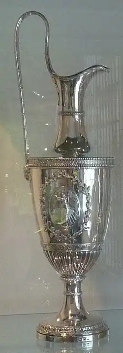 As part of Boulton's efforts to market to the wealthy, he started to sell vases decorated with ormolu, previously a French speciality. Ormolu was milled gold (from the French or moulu) amalgamated with mercury, and applied to the item, which was then heated to drive off the mercury, leaving the gold decoration.[34] In the late 1760s and early 1770s there was a fashion among the wealthy for decorated vases, and he sought to cater to this craze. He initially ordered ceramic vases from his friend and fellow Lunar Society member Josiah Wedgwood, but ceramic proved unable to bear the weight of the decorations and Boulton chose marble and other decorative stone as the material for his vases.[35] Boulton copied vase designs from classical Greek works and borrowed works of art from collectors, merchants, and sculptors.[35]