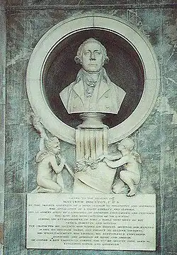 By early 1809 he was seriously ill.[111] He had long suffered from kidney stones, which also lodged in the bladder, causing him great pain.[118] He died at Soho House on 17 August 1809.[111] He was buried in the graveyard of St. Mary's Church, Handsworth, in Birmingham—the church was later extended over the site of his grave. Inside the church, on the north wall of the sanctuary, is a large marble monument to him, commissioned by his son, sculpted by the sculptor John Flaxman.[119] It includes a marble bust of Boulton, set in a circular opening above two putti, one holding an engraving of the Soho Manufactory.[119]