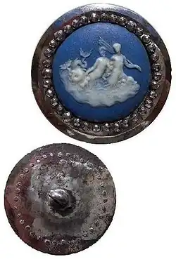 Among Boulton's most successful products were mounts for small Wedgwood products such as plaques, cameo brooches and buttons in the distinctive ceramics, notably jasper ware, for which Wedgwood's firm remains well known. The mounts of these articles, many of which have survived, were made of ormolu or cut steel, which had a jewel-like gleam.[42] Boulton and Wedgwood were friends, alternately co-operating and competing, and Wedgwood wrote of Boulton, "It doubles my courage to have the first Manufacturer in England to encounter with—The match likes me well—I like the Man, I like his spirit."[42]