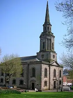 Boulton helped found the New Street Theatre in 1774, and later wrote that having a theatre encouraged well-to-do visitors to come to Birmingham, and to spend more money than they would have otherwise.[101] Boulton attempted to have the theatre recognised as a patent theatre with a Royal Patent, entitled to present serious drama; he failed in 1779 but succeeded in 1807.[103] He also supported Birmingham's Oratorio Choral Society, and collaborated with button maker and amateur musical promoter Joseph Moore to put on a series of private concerts in 1799. He maintained a pew at St Paul's Church, Birmingham, a centre of musical excellence.[101] When performances of the Messiah were organised at Westminster Abbey in 1784 in the (incorrect) belief it was the centennial of Handel's birth and the (correct) belief that it was the 25th anniversary of his death, Boulton attended and wrote, "I scarcely know which was grandest, the sounds or the scene. Both was transcendibly fine that it is not in my power of words to describe. In the grand Halleluja my soul almost ascended from my body."[104]