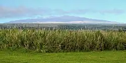 A band of ranch land on Mauna Kea's lower slopes was formerly Acacia koa – Metrosideros polymorpha (koa-ʻōhiʻa) forest.[5] Its destruction was driven by an influx of European and American settlers in the early 19th century, as extensive logging during the 1830s provided lumber for new homes. Vast swathes of the forest were burned and cleared for sugarcane plantations. Most of the houses on the island were built of koa, and those parts of the forest that survived became a source for firewood to power boilers on the sugarcane plantations and to heat homes. The once vast forest had almost disappeared by 1880, and by 1900, logging interests had shifted to Kona and the island of Maui.[60] With the collapse of the sugar industry in the 1990s, much of this land lies fallow but portions are used for cattle grazing, small-scale farming and the cultivation of eucalyptus for wood pulp.[39][71]