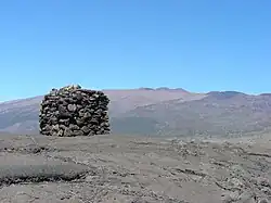Mauna Kea is the only Hawaiian volcano with distinct evidence of glaciation.[23] Similar deposits probably existed on Mauna Loa, but have been covered by later lava flows.[4] Despite Hawaii's tropical location, during several past ice ages a drop of a degree in temperature allowed snow to remain at the volcano's summit through summer, triggering the formation of an ice cap.[34] There are three episodes of glaciation that have been recorded from the last 180,000 years: the Pōhakuloa (180–130 ka), Wāihu (80–60 ka) and Mākanaka (40–13 ka) series. These have extensively sculpted the summit, depositing moraines and a circular ring of till and gravel along the volcano's upper flanks.[28] Subglacial eruptions built cinder cones during the Mākanaka glaciation,[35] most of which were heavily gouged by glacial action. The most recent cones were built between 9,000 and 4,500 years ago, atop the glacial deposits,[34][36] although one study indicates that the last eruption may have been around 3,600 years ago.[37]