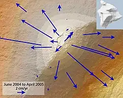 Simplified geophysical models of Mauna Loa's magma chamber have been constructed, using interferometric synthetic aperture radar measures of ground deformation due to the slow buildup of lava under the volcano's surface. These models predict a 1.1 km (1 mi) wide magma chamber located at a depth of about 4.7 km (3 mi), 0.5 km (0 mi) below sea level, near the southeastern margin of Mokuʻāweoweo. This shallow magma chamber is significantly higher-placed than Mauna Loa's rift zones, suggesting magma intrusions into the deeper parts and occasional dike injections into the shallower parts of the rift zone drive rift activity; a similar mechanism has been proposed for neighboring Kīlauea.[32] Earlier models, based on Mauna Loa's 1975 and 1984 eruptions, made a similar prediction, placing the chamber at 3 km (1.9 mi) deep in roughly the same geographic position.[33]