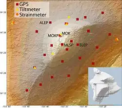 The modern monitoring system on Mauna Loa consists not only of its local seismic network but also of a large number of GPS stations, tiltmeters, and strainmeters that have been anchored on the volcano to monitor ground deformation due to swelling of Mauna Loa's subterranean magma chamber, which presents a more complete picture of the events proceeding eruptive activity. The GPS network is the most durable and wide-ranging of the three systems, while the tiltmeters provide the most sensitive predictive data, but are prone to erroneous results unrelated to actual ground deformation; nonetheless a survey line across the caldera measured a 76 mm (3 in) increase in its width over the year preceding the 1975 eruption, and a similar increase in 1984 eruption. Strainmeters, by contrast, are relatively rare.[77] The Observatory also maintains two gas detectors at Mokuʻāweoweo, Mauna Loa's summit caldera, as well as a publicly accessible live webcam and occasional screenings by interferometric synthetic aperture radar imaging.[76]