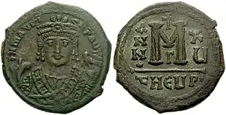 - ^ The full imperial titulature of Maurice, attested in a letter to Childebert II, was Imperator Caesar Flavius Mauricius Tiberius fidelis in Christo mansuetus maximus beneficus pacificus Alamannicus Gothicus [Francicus Germanicus] Anticus Alanicus Vandalicus Erulicus Gepidicus Afric[an]us pius felix inclitus victor ac triumfator semper Augustus ("Emperor Caesar Flavius Maurice Tiberius, faithful in Christ, mild, majestic, bountiful, peaceable; victor over the Alamanni, Goths, [Franks and Germans,] the Antae, Vandals, Heruls, Gepids, in Africa; pious, fortunate, renowned, victorious and triumphant, ever august").[3][4]