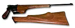 One of the experimental ideas was the creation of a pistol-carbine for use by light cavalry. They had "slab-sided" receivers, standard 10-round magazines, permanently affixed wooden stocks and forends, and lengthened 300 millimetres (12 in) (early production) or 370 millimetres (15 in) (late production) barrels. They were dropped from production after 1899 due to poor sales and little military interest.