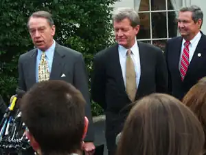 Senator Chuck Grassley (left) and Representative E. Clay Shaw (right) with Baucus at the White House