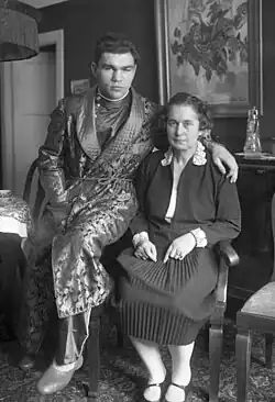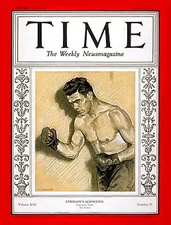 Max Schmeling Jr. was born in Klein Luckow, in the Prussian Province of Brandenburg, the son of Max Sr. and Amanda (née Fuchs) Schmeling. He had an older brother, Rudolf, born in 1902 and a younger sister, Edith, born in 1913.[8] He first became acquainted with boxing as a teenager, when his father took him to watch film of the heavyweight championship match between Jack Dempsey and Georges Carpentier. Impressed with Dempsey's performance in that fight, young Schmeling became determined to imitate his new hero. He began boxing in amateur competitions and, by 1924, won Germany's national amateur title in the light heavyweight division. Shortly thereafter, he turned professional. Ironically, though he idolised the raging, brawling Dempsey, Schmeling developed a careful, scientific style of fighting that lent itself more to counterpunching. Using this style, he won seventeen of his first twenty-three bouts, thirteen by knockout. In 1925, he got into the ring with Dempsey, who was then still heavyweight champion of the world and was touring Europe. Dempsey boxed for two rounds with the then-unknown German and, according to a story later told by Schmeling, was greatly impressed. He proved Dempsey's praises correct on 24 August 1926, when picking up the German light heavyweight championship with a first-round knockout of rival Max Diekmann, who had previously beaten Schmeling.[9] The next year, Schmeling won the European championship by stopping Fernand Delarge in the first boxing match broadcast live in Germany. After defending both titles against Hein Domgoergen the same year and, in 1928, the European Title with a first-round knockout of Michele Bonaglia, he secured the German heavyweight championship with a points victory against Franz Diener and decided to chase bigger fights and bigger purses in the United States.