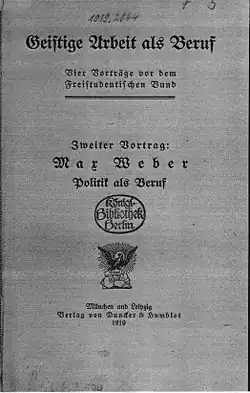 Towards the end of his life, Weber gave two lectures, "Science as a Vocation" and "Politics as a Vocation", at the Ludwig Maximilian University of Munich on the subjects of the scientific and political vocations. The Free Student Youth, a left-liberal student organisation, had their spokesperson, Immanuel Birnbaum, invite him to give the lectures.[294] In "Science as a Vocation", he argued that a scholar needed to possess an inner calling. Weber thought that only a particular type of person could be an academic, stating that the path forward in scholarship required the scholar to be methodical in their research and understand that they might not succeed. Specialisation was also an aspect of modern scholarship that a scholar needed to engage in.[84] Disenchantment and intellectual rationalisation were major aspects of his commentary on the scholar's role in modernity. They resulted in scholarship's value being questioned. Weber argued that scholarship could provide certainty through its starting presumptions, despite its inability to give absolute answers.[295] Meanwhile, "Politics as a Vocation" commented on the subject of politics.[97] Weber was responding to the early Weimar Republic's political instability. He argued that politicians had passion, judgement, and responsibility.[296] There was also a division between conviction and responsibility. While these two concepts were sharply divided, it was possible for single individual – particularly the ideal politician – to possess both of them.[98] He also divided legitimate authority into the three categories of traditional, charismatic, and rational-legal authority.[297] Towards the lecture's end, he described politics as "a slow, powerful drilling through hard boards".[298] Ultimately, Weber thought that the political issues of his day required consistent effort to resolve, rather than the quick solutions that the students preferred.[299]