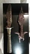 In December 2006, Italian archaeologists announced that an excavation under a shrine near the Palatine Hill had unearthed several items in wooden boxes, which they identified as the imperial regalia, possibly belonging to Maxentius.[28] The items in these boxes, which were wrapped in linen and what appears to be silk, include three complete lances, four javelins, what appears to be a base for standards, and three glass and chalcedony spheres. The most important find was a sceptre of a flower holding a blue-green globe, which is believed to have belonged to the Emperor himself because of its intricate workmanship, and has been dated to his rule.[29]