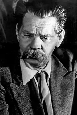 In the Soviet Union, the complexities in Gorky's life and outlook and literary work were reduced to an iconic image (echoed in heroic pictures and statues dotting the countryside): Gorky as a great Soviet writer who emerged from the common people, a loyal friend of the Bolsheviks, and the founder of the increasingly canonical "Socialist Realism".[75] At the same time, such treatment of Gorky as a "state poet" and a Socialist Realism writer and his political career greatly compromised his reputation and his literary legacy, especially in the West: Aleksandr Solzhenitsyn later would call him "an apologist for executioners," although later scholars wrote about his contradictory relationship with the Bolsheviks and such points as his condemnation of the Red Terror and complicated relationships with Stalin (see above); the German scholar of Gorky Armin Knigge has concluded that Gorky "was never a Stalinist." In regards to his literary legacy, Knigge stated that Gorky is "not a classical writer like Fyodor Dostoevsky, but a representative of world literature" and a "rigorous observer on a level comparable to German writer Thomas Mann."[76] In the West, out of his dramatical works, The Lower Depths (1902) has been the only play to retain a significant position in theatre, and only few of his early short stories had been influential;[77] in the last years, some of Gorky's works written before the Revolution, like the play Children of the Sun (1905), and the early short stories, have been staged and republished.[76] Richard Freeborn writes that although his reputation suffered because of his political career, "nowadays his achievement as the creator of many vivid portraits, as a brilliant memoirist and autobiographer and successor to Chekhov as a dramatist is undeniable."[78] At the same time, even his best-known works, such as The Lower Depths and the novel Mother (1906) are hardly available in the West, and his other works, including the post-revolutionary novels The Artamonov Business (1925) and The Life of Klim Samgin which have received positive acclaim among critics (see below) have not been republished for a long time; according to Aaron Lake Smith (Lapham's Quarterly), "Gorky's work is so unavailable that it’s almost suspicious, as if there might still be a wizened Cold Warrior clanking away in a basement office somewhere in Washington..." In Russia, his figure is better known because of his former state-sponsored cult, but "his legacy has been overtaken by a kind of fog, widely depoliticized and misunderstood."[79]