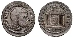 Maximian with veil (capite velato) on a coin issued by Maxentius in 309–312