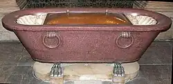 The porphyry sarcophagus of Maximian. It was moved from his mausoleum and is now serving as the baptismal font of the Cathedral of Milan.[126]