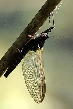 Male adults may patrol individually, but most congregate in swarms a few metres above water with clear open sky above it, and perform a nuptial or courtship dance. Each insect has a characteristic up-and-down pattern of movement; strong wingbeats propel it upwards and forwards with the tail sloping down; when it stops moving its wings, it falls passively with the abdomen tilted upwards. Females fly into these swarms, and mating takes place in the air. A rising male clasps the thorax of a female from below using his front legs bent upwards, and inseminates her. Copulation may last just a few seconds, but occasionally a pair remains in tandem and flutters to the ground.[19] Males may spend the night in vegetation and return to their dance the following day. Although they do not feed, some briefly touch the surface to drink a little water before flying off.[19] The sperm transfer is direct as in Neoptera, contrasting with the indirect insemination of Odonata.[20]