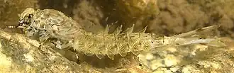 In most species, the nymphs are herbivores or detritivores, feeding on algae, diatoms or detritus, but in a few species, they are predators of chironomid and other small insect larvae and nymphs.[28][29] Nymphs of Povilla burrow into submerged wood and can be a problem for boat owners in Africa and southeast Asia.[30] Some are able to shift from one feeding group to another as they grow, thus enabling them to utilise a variety of food resources. They process a great quantity of organic matter as nymphs and transfer a lot of phosphates and nitrates to terrestrial environments when they emerge from the water, thus helping to remove pollutants from aqueous systems.[8] Along with caddisfly larvae and gastropod molluscs, the grazing of mayfly nymphs has a significant impact on the primary producers, the plants and algae, on the bed of streams and rivers.[31]