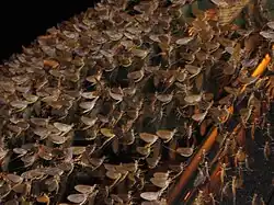 Often, all the individuals in a population mature at once (a hatch), and for a day or two in the spring or autumn, mayflies are extremely abundant, dancing around each other in large groups, or resting on every available surface.[7] In many species the emergence is synchronised with dawn or dusk, and light intensity seems to be an important cue for emergence, but other factors may also be involved. Baetis intercalaris, for example, usually emerges just after sunset in July and August, but in one year, a large hatch was observed at midday in June. The soft-bodied subimagos are very attractive to predators. Synchronous emergence is probably an adaptive strategy that reduces the individual's risk of being eaten.[17] The lifespan of an adult mayfly is very short, varying with the species. The primary function of the adult is reproduction; adults do not feed and have only vestigial mouthparts, while their digestive systems are filled with air.[16] Dolania americana has the shortest adult lifespan of any mayfly: the adult females of the species live for less than five minutes.[18]